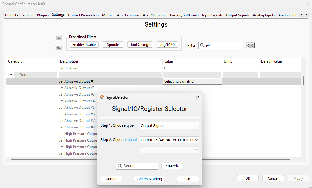 Then he was able to adjust the delay between the Jet Pressure output and the Abrasive output in the settings dialog.